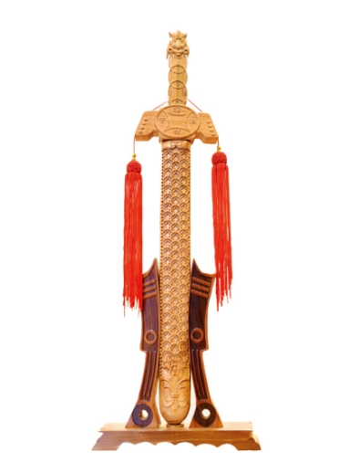 桃木为五木之精,亦称仙木,在中国传统文化习俗中被认为有镇宅、纳福、辟邪、招财等美好的寓意,桃木剑为其代表性的作品。