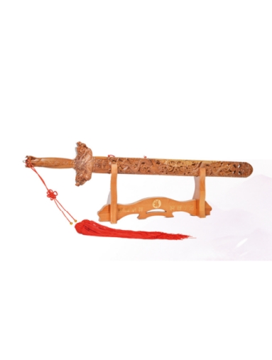 桃木为五木之精,亦称仙木,在中国传统文化习俗中被认为有镇宅、纳福、辟邪、招财等美好的寓意,桃木剑为其代表性的作品。